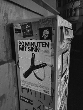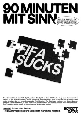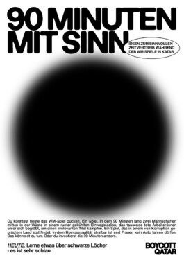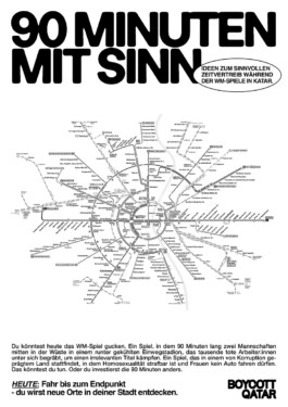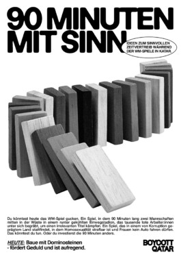 Als Grafiker finde ich es wichtig, auch aus eigenem Antrieb und ohne Auftraggeber:in die eigenen Fähigkeiten zu nutzen, um zu gesellschaftlich relevanten Themen Stellung zu beziehen. Ein solches Thema war die Fußball-Weltmeisterschaft 2022, die vor allem durch Menschenrechtsverletzungen und Klimaschäden auf sich aufmerksam machte. Da meines Erachtens jede:r die dunklen Seiten dieser Weltmeisterschaft durch die mediale Aufmerksamkeit erfahren hat, sah ich meinen Auftrag nicht in der Aufklärung oder dem Verurteilen der Zuschauenden. Vielmehr habe ich durch meine „90 Minuten mit Sinn“, die im öffentlichen Raum (mit besonderem Fokus auf Sportkneipen) plakatiert wurden, alternative, sinnvolle Beschäftigungen für 90 Minuten aufgezeigt.