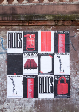 Design can be a means of hope. It can express resistance and bring about change in society as a whole. Design connects people through the visual. This connection was more important than ever during the coronavirus pandemic. My bachelor's thesis “Auf die Barrikaden” initiates protest in the form of posters and installations in public spaces. In this way, it draws attention to the ongoing cultural decline. The process and results were documented and illustrated on 225 pages together with a visual overview of the role of design in the protest.