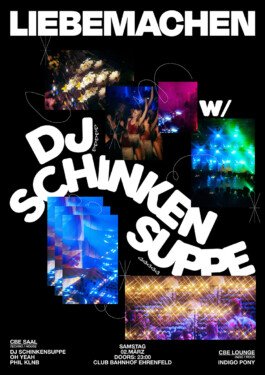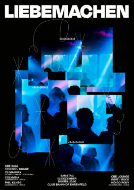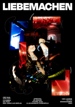 Veranstaltungsplakate für die Indie-Partyreihe "Liebemachen", die seit über 15 Jahren im Club Bahnhof Ehrenfeld stattfindet.