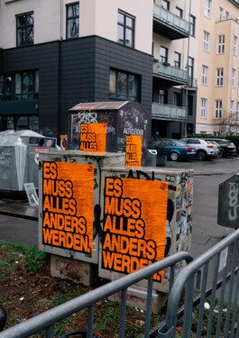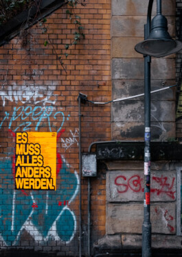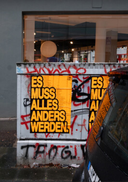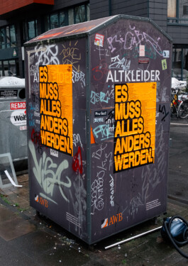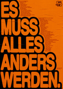 Wenn der Regisseur Wim Wenders eine große Plakatwand mit einem Motiv seiner Wahl gestalten könnte, wäre es der Spruch: Es muss alles anders werden. Um ihm diesen Wunsch zu erfüllen und gleichzeitig dieses, für die momentane Zeit sehr passendes, Motto auf den Straßen zu verbreiten, habe ich ein Plakat mit ebendiesem Spruch gestaltet. Es ruft zu mehr Gemeinschaft und Zusammenhalt auf, hilft den Betrachtenden ihr eigenes Handeln zu überdenken und verbreitet eine gewisse Grundhaltung im öffentlichen Raum, die die Menschen wieder mehr zusammenbringen soll.