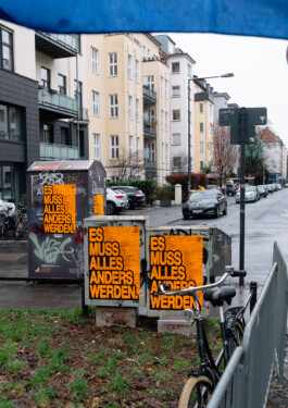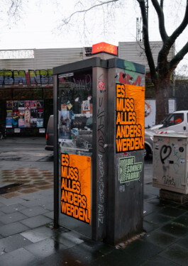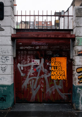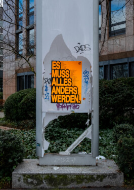 If the director Wim Wenders could design a large billboard with a motif of his choice, it would be the slogan: Everything must change. To fulfill his wish and at the same time spread this motto, which is very appropriate for the current times, on the streets, I designed a poster with this very slogan. It calls for more community and cohesion, helps viewers to rethink their own actions and spreads a certain basic attitude in public spaces that should bring people together again.