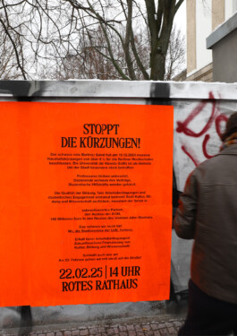Due to the threatening situation, various Berlin universities and educational institutions have joined forces to demonstrate against the cuts in front of the Rotes Rathaus. In order to give the demonstrators a form of visual expression, some students and I have made demonstration signs and made them available to all interested parties. You can find more information about the cuts and their consequences HERE.